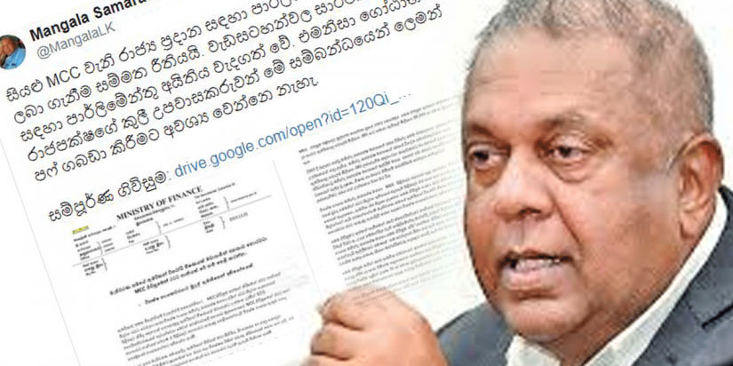 මිලේනියම් චැලෙන්ජ් ගිවිසුමට විරුද්ධව උපවාස කරන්නේ ගෝඨාභය රාජපක්ෂගේ කුලී උපවාසකරුවන් බවට මුදල් ඇමැති මංගල සමරවීර සිය ට්විටර් ගිණුමේ ඊයේ (05 වැනිදා) සවස සටහනක් තබා ඇත.