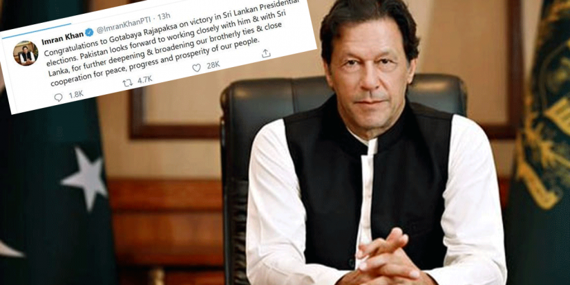 ජනාධිපතිවරණයෙන් ලැබූ ජයග්‍රහණය සම්බන්ධව ජනාධිපති ගෝඨාභය රාජපක්ෂ මහතාට සිය සුබපැතුම් එක්කරන බව පකිස්තානු අගමැති ඉම්රාන් ඛාන් මහතා සනහන් කරයි.