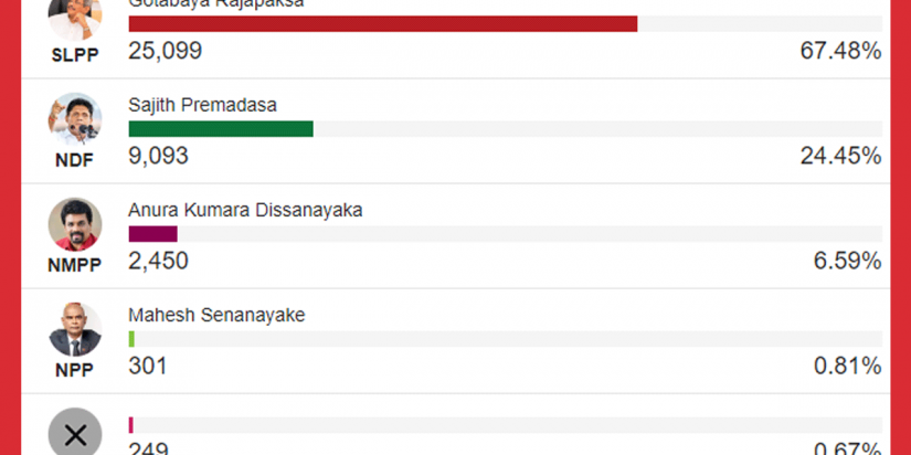 ඒ අනුව ගාල්ල දිස්ත්‍රික්කයේ ඡන්ද 25, 099 කින් ශ්‍රි ලංකා පොදු ජන පෙරමුණේ ජනාධිපතිධූර අපේක්ෂක ගෝඨාභය රාජපක්ෂ මහතා දිනා ගෙන තිබේ.