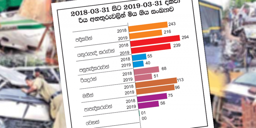 කෙසේ නමුත් 2018 වසරේ එම සංඛ්යාව 849ක් ලෙස සටහන් විය. ඒ අනුව 2018ට සාපේක්ෂව මේ වසරේ මාර්තු අවසානය වන විට මාර්ග අනතුරුවලින් මිය යන්නන්ගේ සංඛ්යාව 151කින් අඩුවී ඇත. එය සාධනීය ප්රවණතාවක් බව මාර්ග ආරක්ෂාව පිළිබඳ ජාතික සභාවේ සභාපති වෛද්ය සිසිර කෝදාගොඩ මහතා පවසයි.
