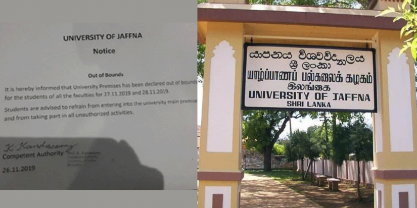 යාපනය ආරක්ෂක අංශ පැවසූවේ යාපනය විශ්ව විද්යාල සිසුන් මහවිරු සැමරුම් වැඩසටහනක් අද(27) විශ්ව විද්යාල භූමියේ පැවැත්වීමට කටයුතු සංවිධානය කොට තිබු බැවින් අදාළ ක්රියාව නවතා දැමීම වෙනුවෙන් විශ්ව විද්යාල සිසුන් වෙත දින දෙකක කාලයක් තුළ විශ්ව විද්යාලයේ කිසිදු කටයුත්තක් සිදු නොකරන ලෙසට පාලක සභාව දැනුම් දී ඇති බවයි.