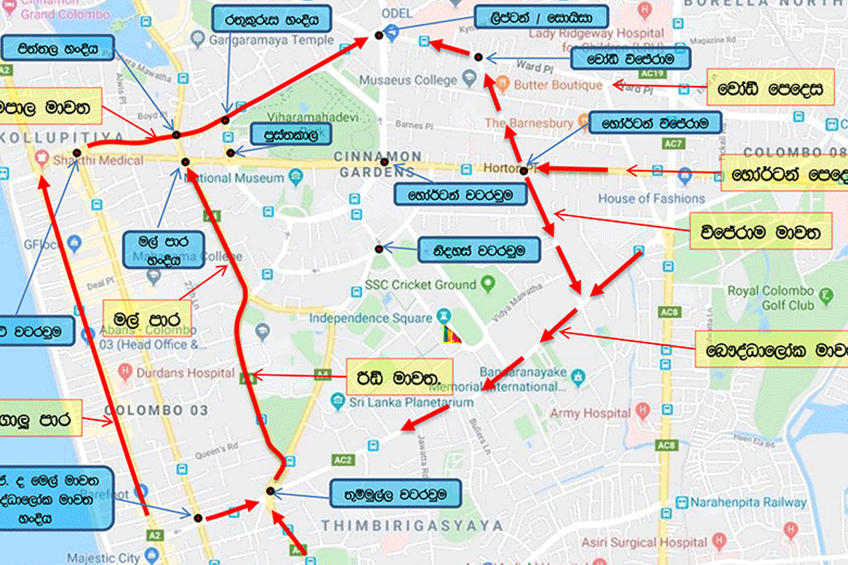 නිදහස් මාවත, විද්යා මාවත, මෙට්ලන්ඩ් පෙදස, කන්නංගර මාවත, මාකස් ප්රනාන්දු මාවත, පදනම් පාර, විජේරාම පාර හෝටන් පෙදෙස දක්වා හෙට(3) උදැසන 7 සිට දහවල් 12 දක්වා වසා තබන බව පොලි