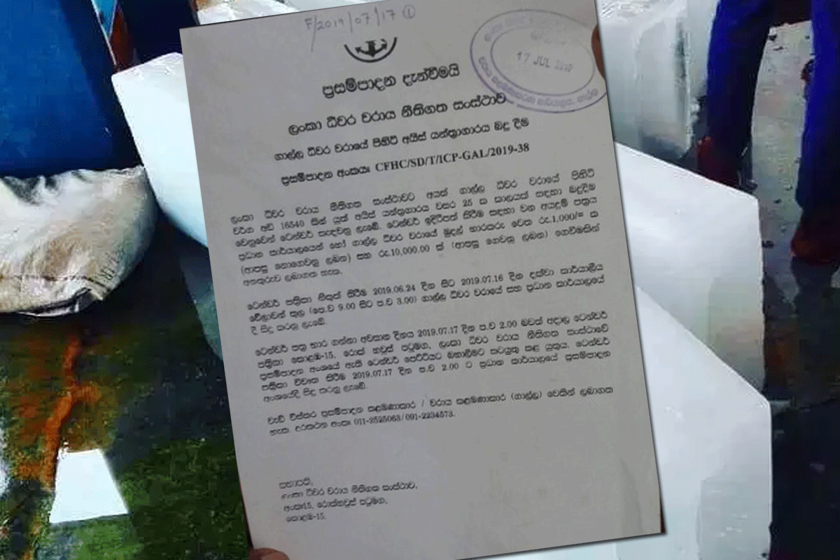 ලංකා ධීවර සංස්ථාවට අයත් ගාල්ල වරාය භූමියේ මෙහෙයුම් කටයුතු සිදුකරන අයිස් යන්ත්රාගාරය පුද්ගලික ව්යාපාරිකයෙකුට බදු දීමේ සැලසුමක් රහසිගතව ක්රියාත්මක වන බව ලංකා ධීවර සංස්ථා